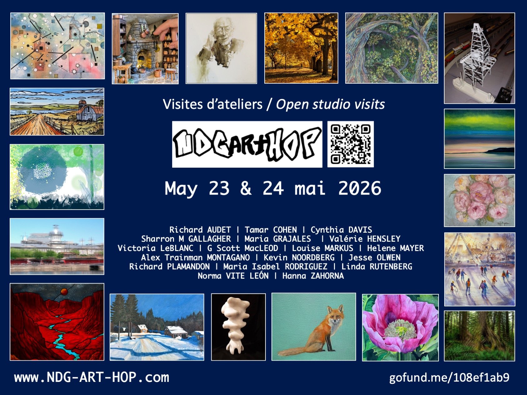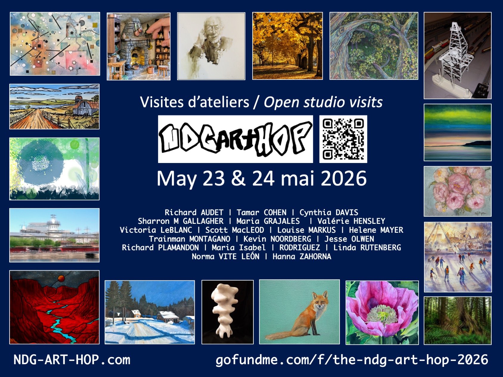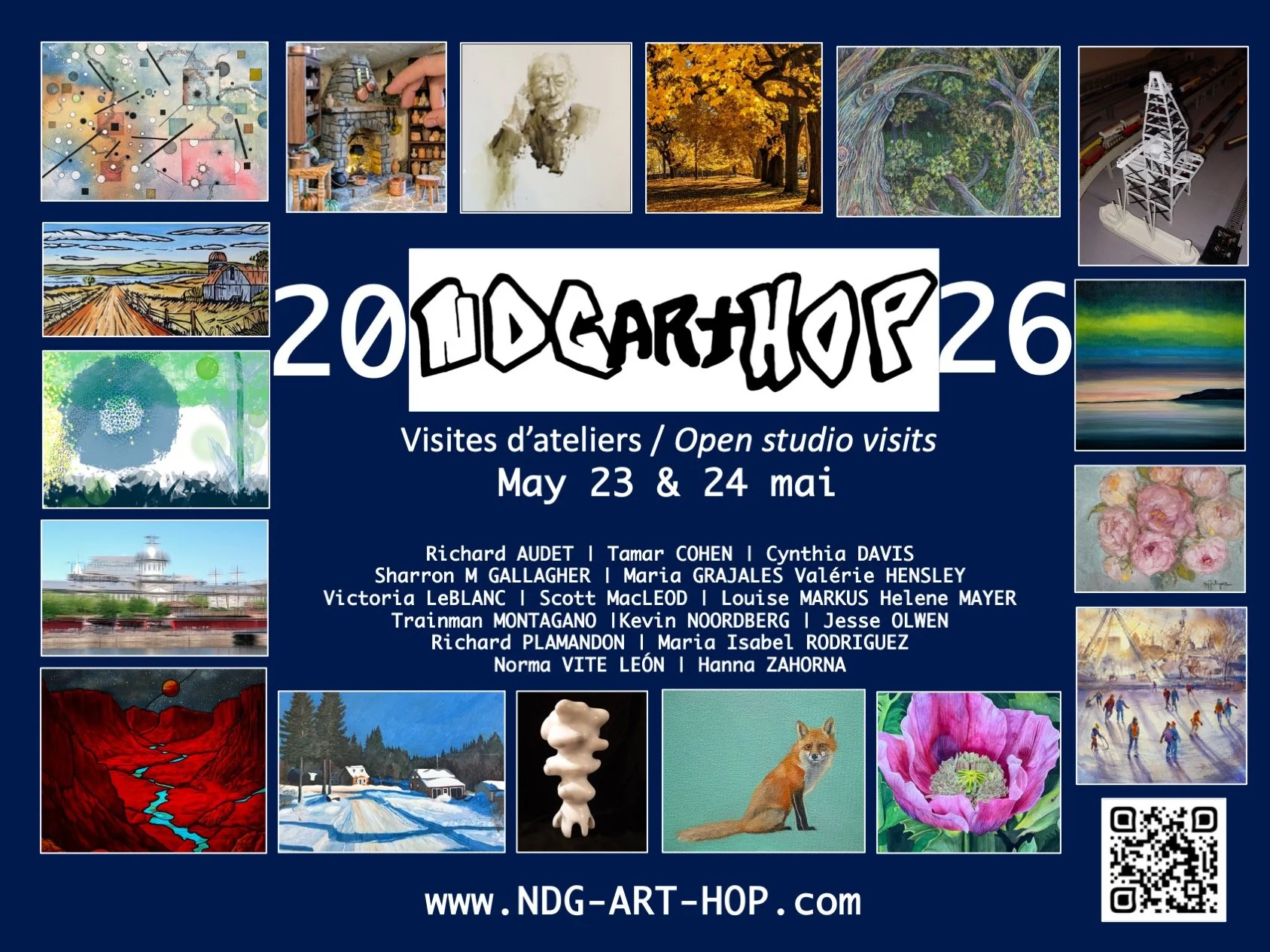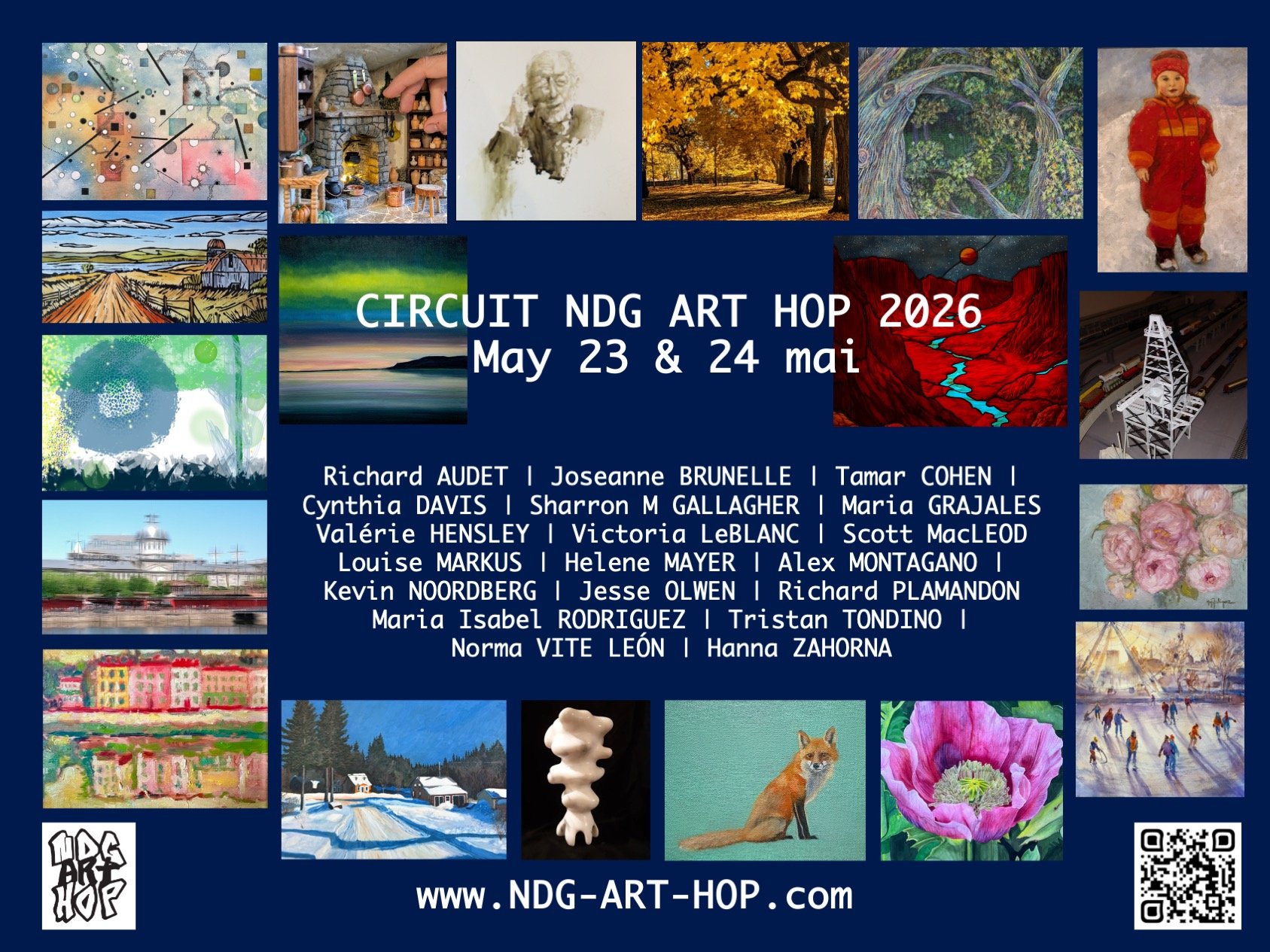 The NDG ART HOP 2025 was a huge success and we invite you to join us again this year as we continue to promote the important work of visual artists living and creating in NDG. Your visits to our studios provide unique opportunities to discover the artistic vitality of your neighbourhood as well as an occasion to meet new people with the same love for art. NDG ART HOP 2025 a été un énorme succès et nous vous invitons à nous rejoindre cette année alors que nous continuons à promouvoir le travail important des artistes visuels vivant et créant à NDG. Visiter leurs ateliers est une occasion uniques de découvrir la vitalité artistique qui règne au cœur de votre quartier et par la même occasion de faire des rencontres avec des gens qui partage le même amour pour l’art.